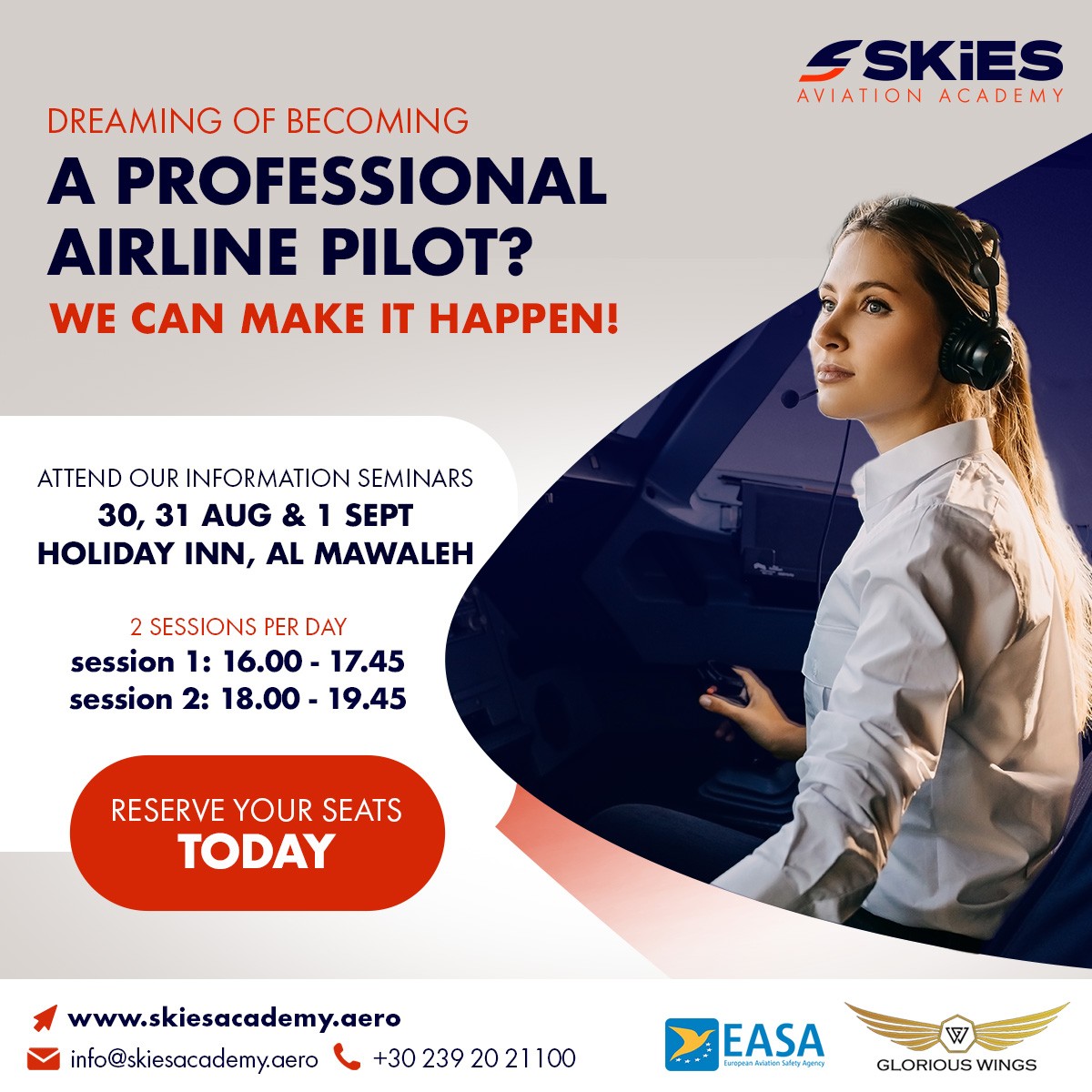 We are delighted to invite all future pilots to attend our free informational seminars which will be held between the 30th and 1st of September at the Holiday Inn, Al Mawaleh. Get ready for a 3-day event full of interesting sessions with our qualified staff who will answer all of your questions about the aviation industry as well as provide all the relevant information about our courses and academy.